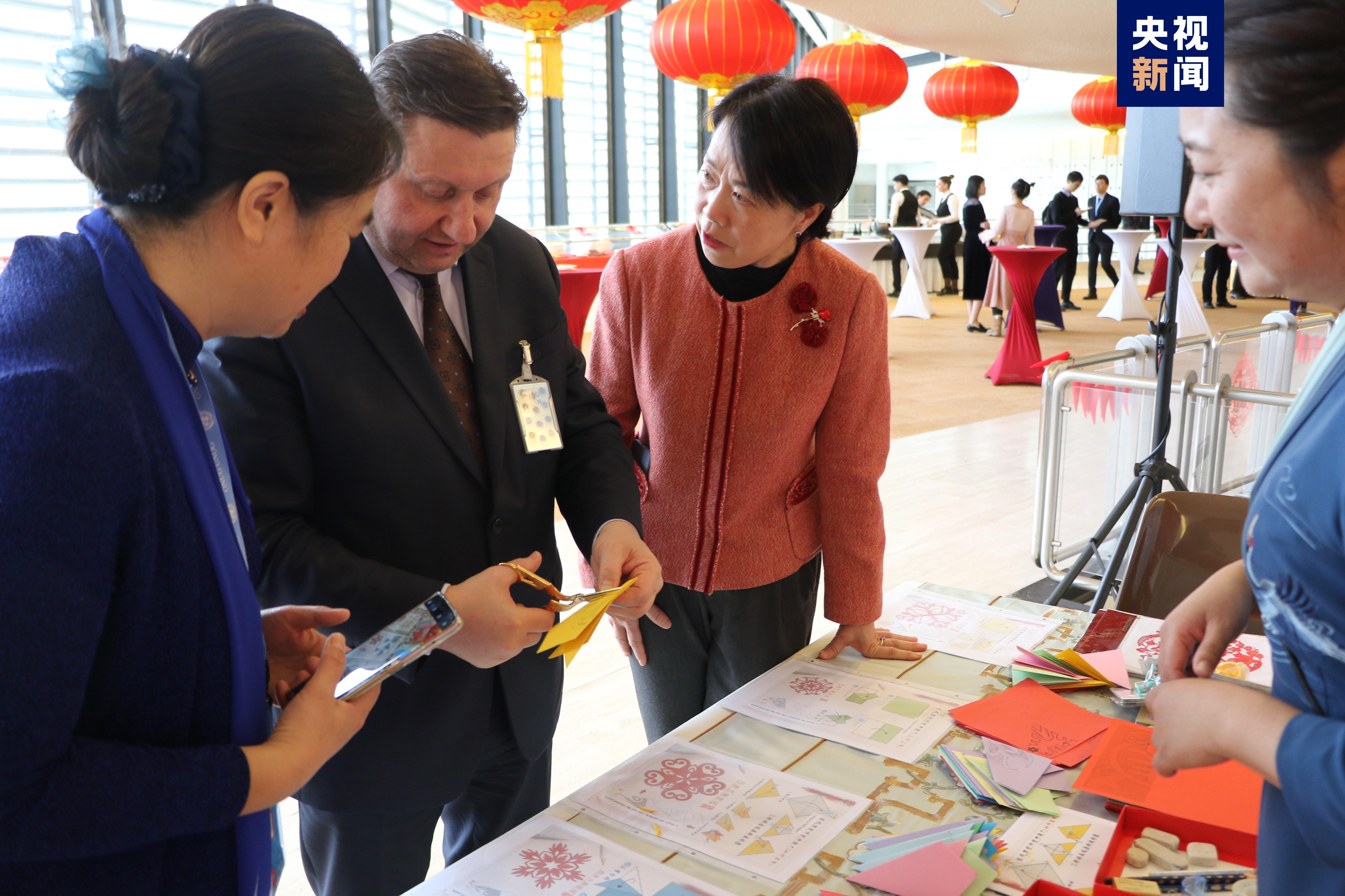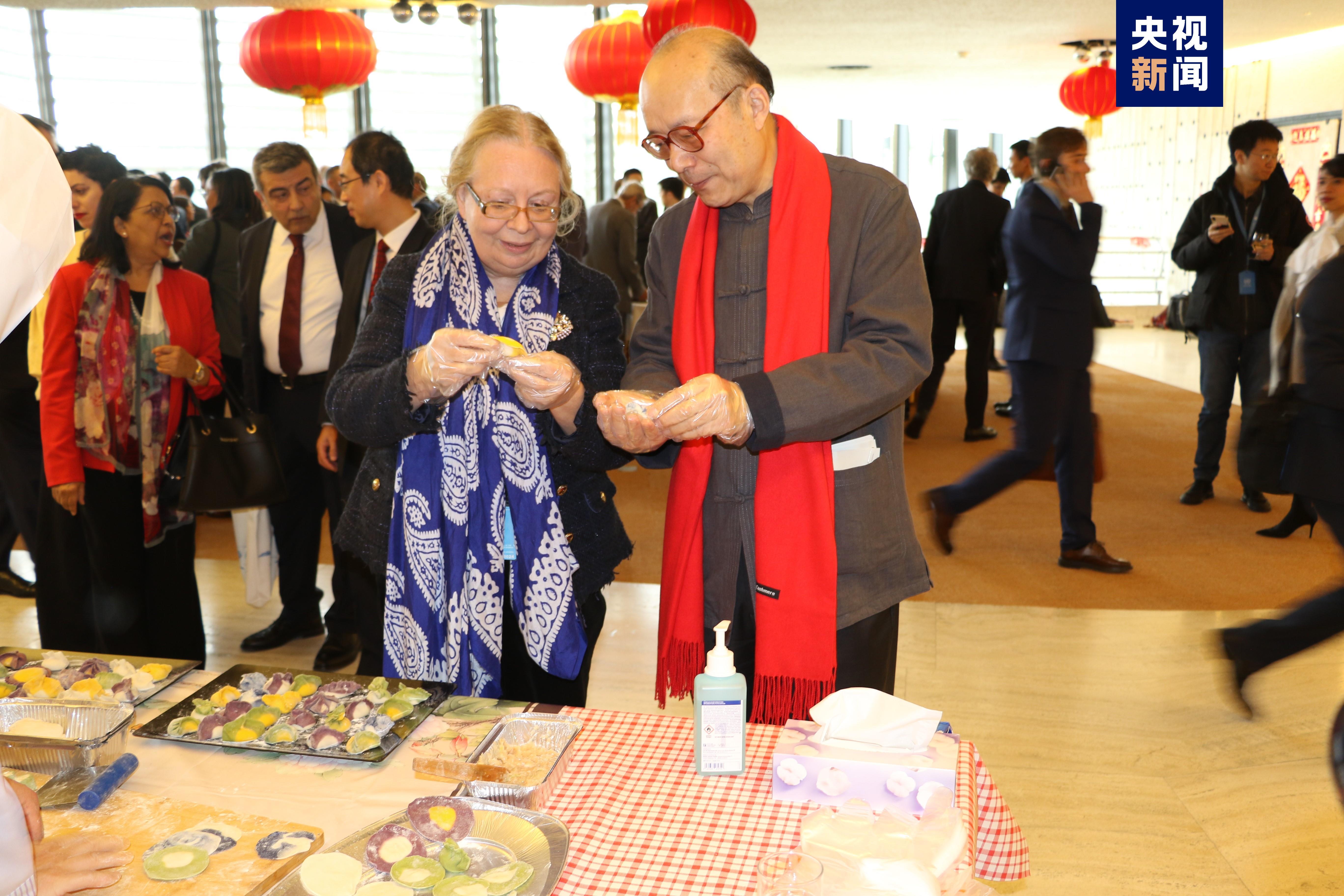 活动当天,来自各国的外交使节和国际组织官员们在万国宫沉浸式体验了中国年。各国来宾亲身体验包饺子、剪窗花,感受中国春节文化和浓浓年味。活动现场,“春碗”“五龙戏珠盘”“春晚吉祥物”等总台春晚文创产品深受嘉宾喜爱。